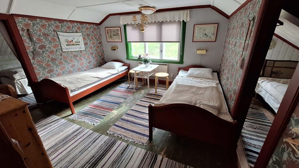 Rummet är utrustat med fyra enkelsängar, varav två med måtten 90×200 cm är placerade i det större rummet. De övriga två, med måtten 80×200 cm, finns i rummets kattvindar, vilket skapar en praktisk och flexibel sovlösning för flera gäster.